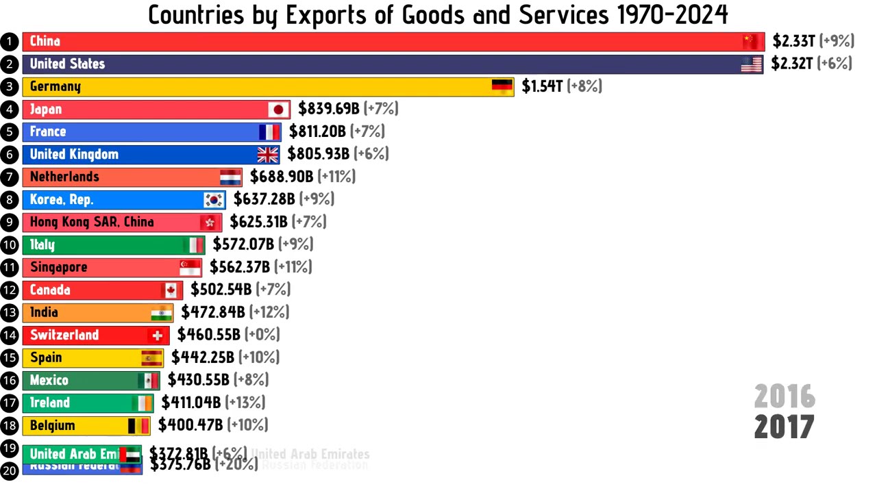 Let’s trace the evolution of the world’s top exporting nations from 1970 to 2024 — and reveal the most powerful exporter of 2025.
